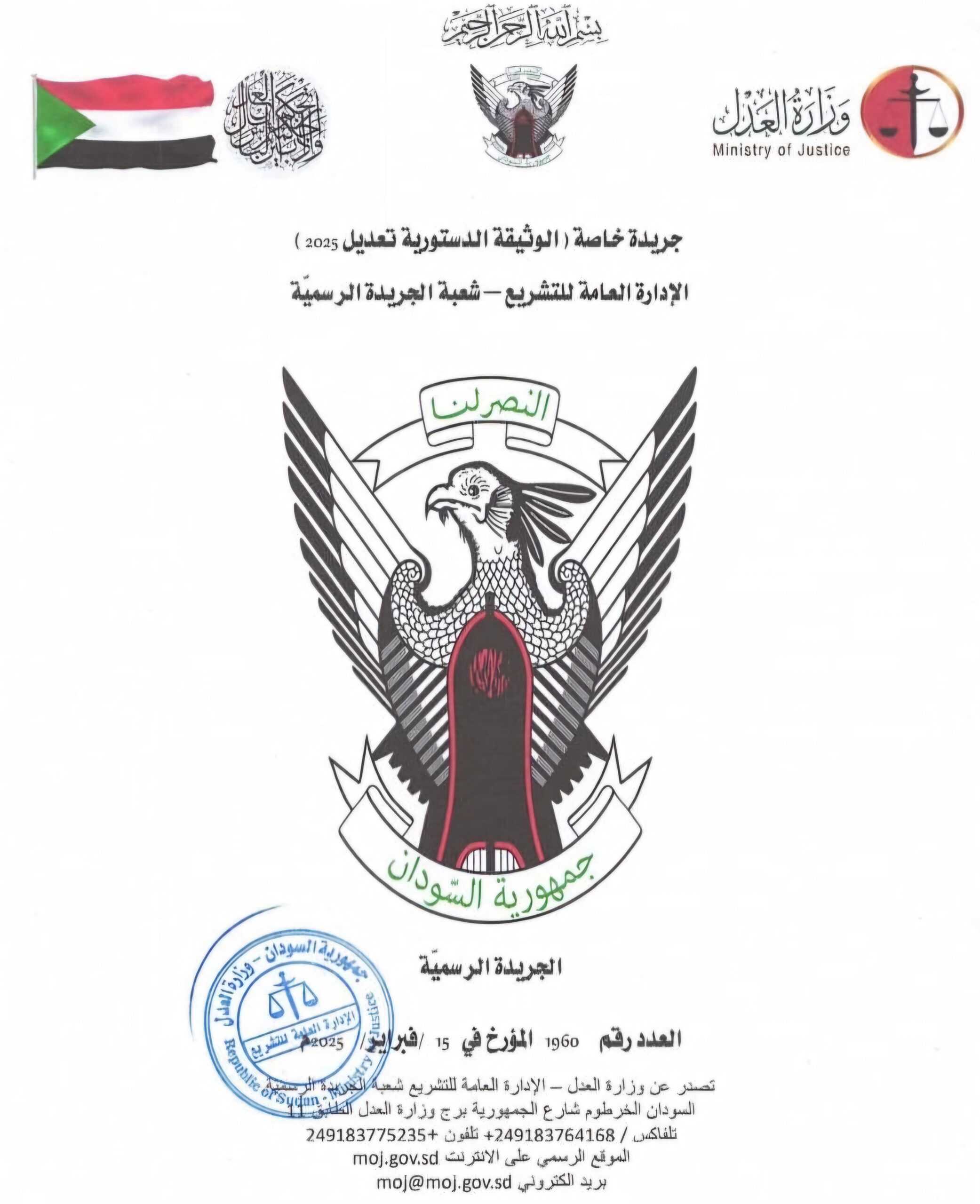 بهذا أشهد بأن مجلسي السيادة والوزراء قد أجازا الوثيقة الدستورية الانتقالية (تعديل) لسنة ٢٠٢٥ ، في جلسته رقم (۲) في اليوم العشرين من شهر شعبان سنة ١٤٤٦هـ الموافق اليوم التاسع عشر من شهر فبراير سنة ٢٠٢٥م.
