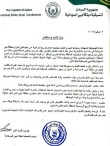 وأعلنت التنسيقية عن رفضها وجود الإدارية التابعة لجنوب السودان المحتلة للمنطقة، فضلا عن رفض وجود الإدارة الأهلية التابعة لمليشيات الدعم السريع الارهابية بالمنطقة التي تعتبر منطقة منزوعة السلاح.