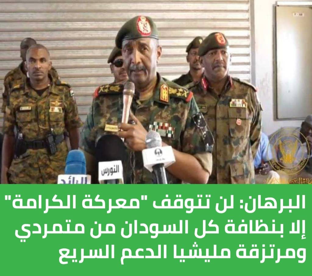 أكد رئيس مجلس السيادة الإنتقالي الفريق أول ركن عبدالفتاح البرهان، ان معركة الكرامة لن تتوقف إلا بنظافة كل السودان من متمردي ومرتزقة مليشيا الدعم السريع الإرهابية المتمردة ، واسترداد كرامة الشعب السوداني .