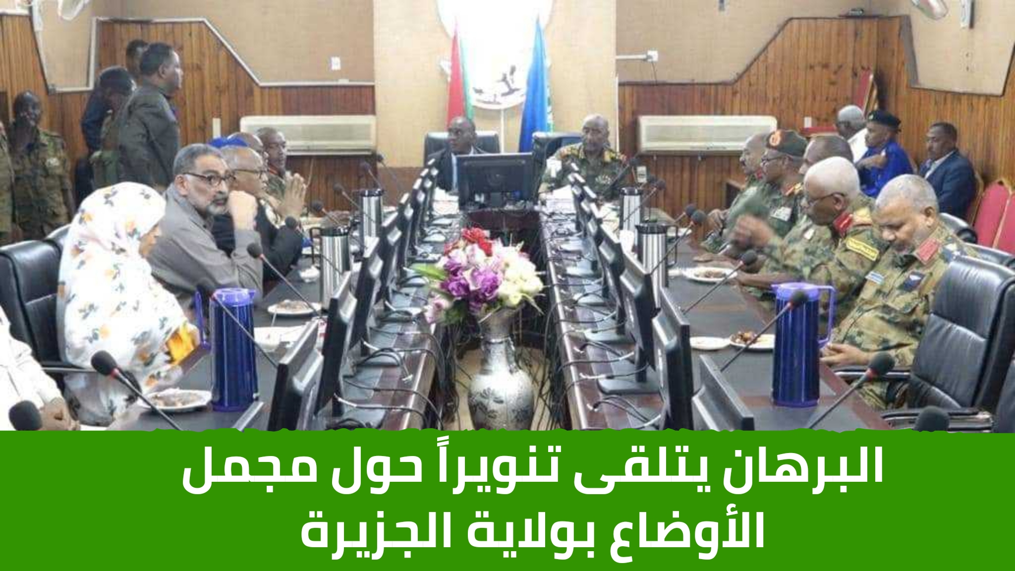 تلقى رئيس مجلس السيادة القائد العام للقوات المسلحة الفريق أول ركن عبدالفتاح البرهان اليوم بمدينة مدني ، تنويراً من والي ولاية الجزيرة الطاهر ابراهيم الخير حول مجمل الأوضاع بولاية الجزيرة لاسيما الأوضاع الأمنية .
