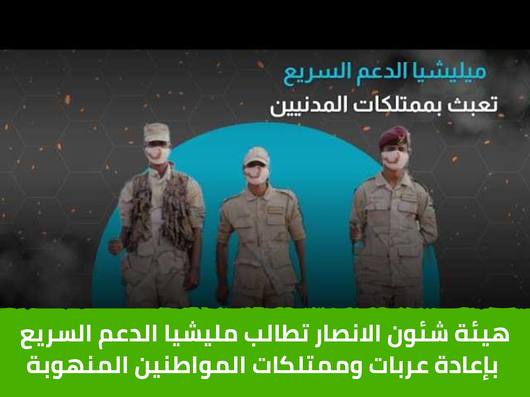 طالبت هيئة شؤون الأنصار ، بإعادة عربات وممتلكات المواطنين المنهوبة فوراً ، لأهلها وتعويض الخسائر التي لحقت الأبرياء في هذه الحرب ، وأكدت عبثيتها بقدر ما تزداد مآسيها وتتضاعف انتهاكاتها كل يوم، فضلاً عن أنها حرب تدمير تفتقد لأي مبرر أخلاقي.