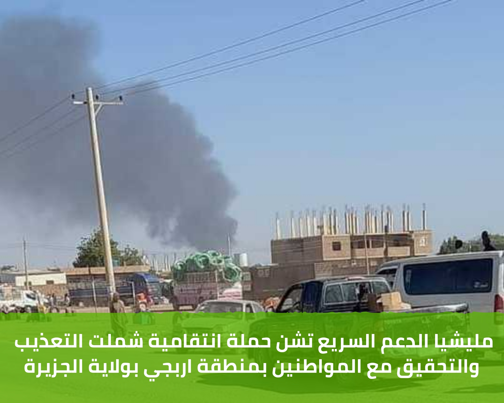 قالت لجان مقاومة أربجي بولاية الجزيرة أن قوة تابعة لمليشيا الدعم السريع شنت حملة انتقامية شملت التعذيب والتحقيق مع المواطنين لمعرفة الجهة التي تواصلت مع أبو عاقلة كيكل ولجنة حسم التفلتات .