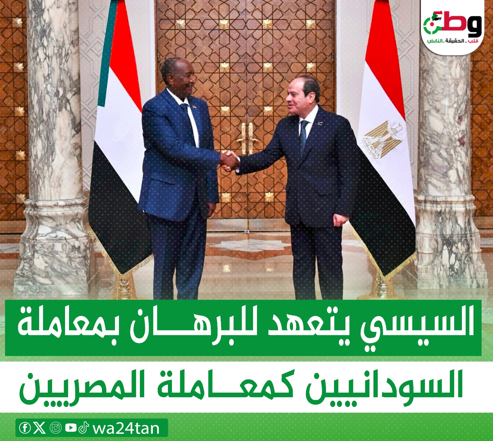 وأعلن الرئيس خلال اجتماعه المشترك مع رئيس مجلس السيادة، الفريق أول ركن عبد الفتاح البرهان، التزامه بمُعاملة الشعب السوداني المُقيم في وطنهم الثاني مصر كمعاملة أشقائهم المصريين في التعليم والعلاج وتسهيل إجراءات الإقامة.
