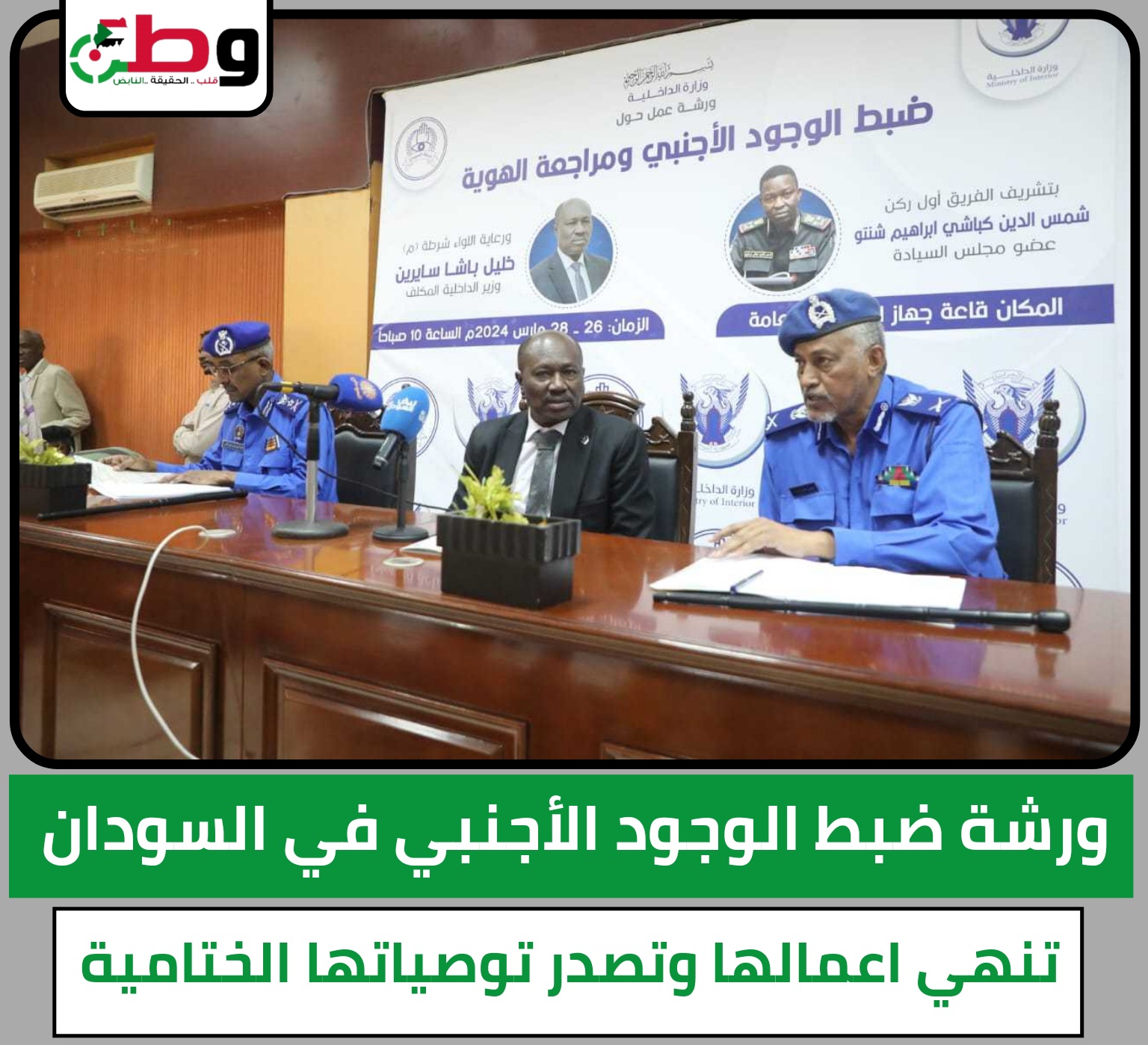 أنهت ورشة ضبط الوجود الأجنبي ومراجعة الهوية أعمالها وأصدرت توصياتها الختامية بعد ثلاثة أيام من التداول حول الأوراق المختصة بمشاركة وزير الداخلية اللواء شرطة (م) خليل باشا سايرين، ومدير عام الشرطة وعدد من الوزراء والولاة وممثلي الوزارات والهيئات والمفوضيات ذات الصلة بالوجود الأجنبي في السودان.