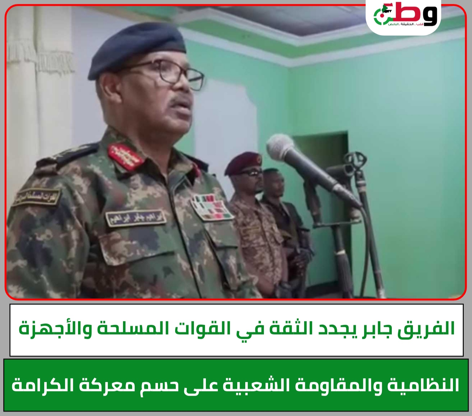 وحيا الفريق جابر الشعب السوداني والقوات المسلحة وكل الاجهزة النظامية والمقاومة الشعبية الذين بذلوا الغالي والنفيس حفاظا علي سيادة ووحدة السودان.