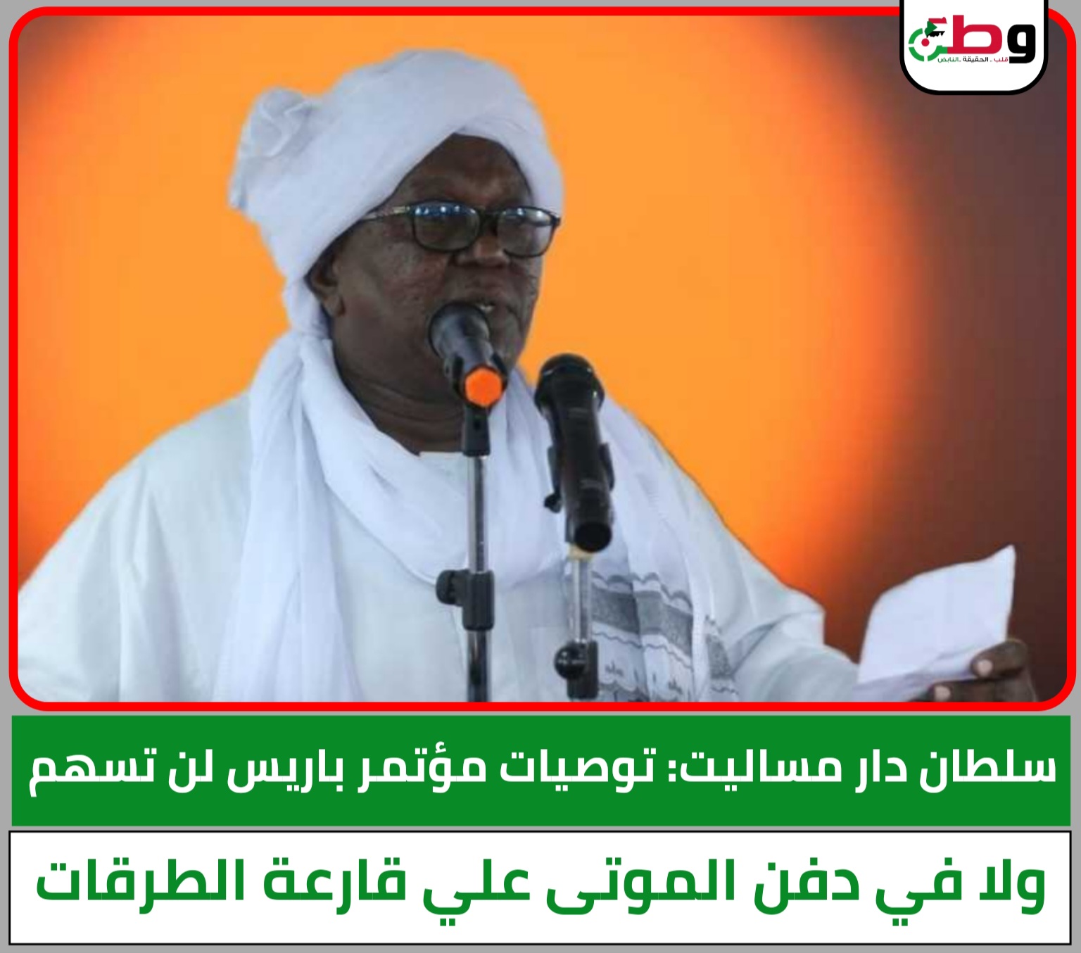 قال سلطان دار مساليت سعد بحر الدين ، إنّ مخرجات مؤتمر باريس وتوصياته لن تحل مشكلة السودان والأهل المشردين، ولن تتسهم ولا حتى في دفن الموتى على قارعة الطرقات .