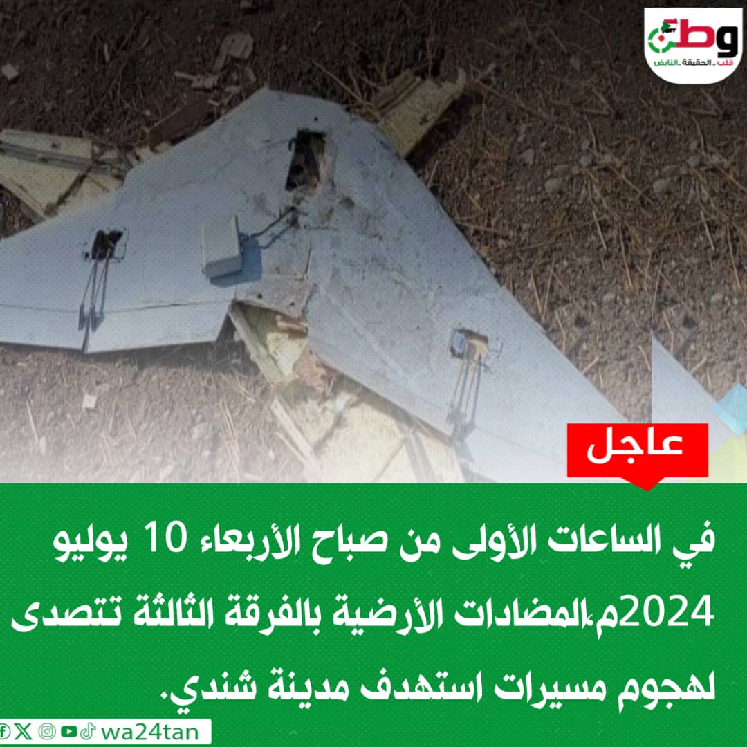في الساعات الأولى من صباح الأربعاء 10 يوليو 2024م، المضادات الأرضية بالفرقة الثالثة تتصدى لهجوم مسيرات استهدف مدينة شندي